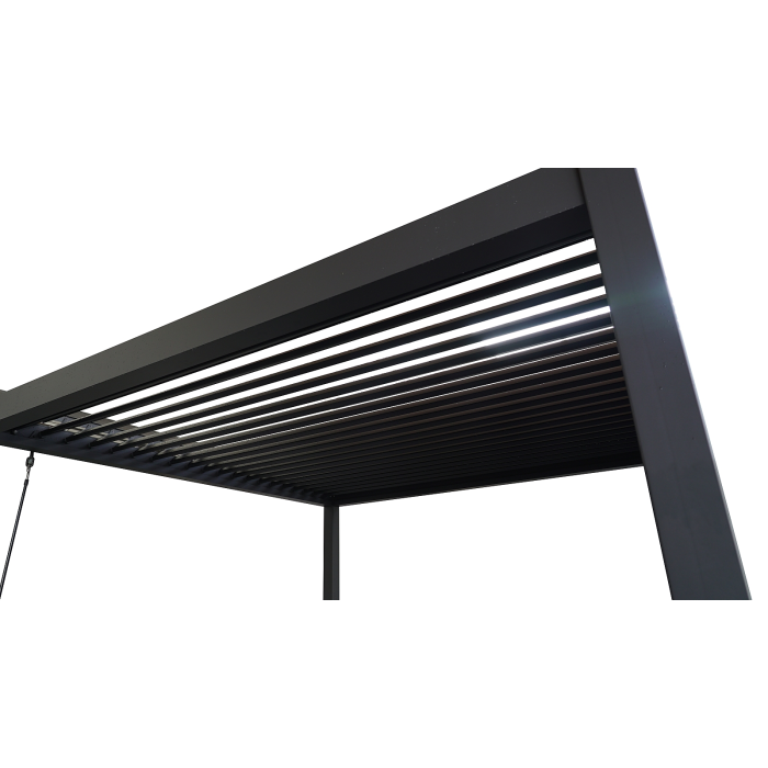 A LANITPLAST PREMIUM szabadon álló, 5 x 3 méteres, lapos tetős bioklimatikus pergola praktikus és elegáns megoldás a kertben található kültéri ülősarok fedésére. A robusztus és stabil szerkezet modern antracit színű (RAL 7043) matt felülettel könnyen illeszkedik bármilyen környezetbe, és nem igényel falhoz való rögzítést. Az egész pergola, beleértve a forgó lamellákat is, alumíniumból készült, és minden alkatrész porfestett (komaxit) bevonattal rendelkezik. A összesen 21 forgó lamella megbízható védelmet nyújt a nap sugaraitól és az esőtől. Dőlésszögük fokozatmentesen állítható a teljesen zárt pozíciótól (0°) a 90°-os teljes nyitásig. A lamellák vezérlése manuális, egy praktikus kar segítségével történik, amely úgy van kialakítva, hogy lehessen dönteni, így megakadályozva a pergola felületének megsérülését a kezelés során.Elhelyezkedése emellett lehetővé teszi más kiegészítők, például oldalsó függönyök vagy szúnyoghálók problémamentes használatát anélkül, hogy azok funkcionalitását korlátozná.