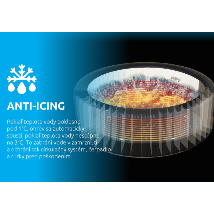Systém ANTI-ICING bude neustále dohliadať na vašu vírivú vaňu a strážiť bezpečnú úroveň teploty. Pokiaľ teplota vody poklesne pod 1°C, ohrev sa automaticky spustí, pokiaľ teplota vody nestúpne na 3°C. Toto zabráni vode v zamrznutí a ochráni tak cirkulačný systém, čerpadlo a rúrky pred poškodením.