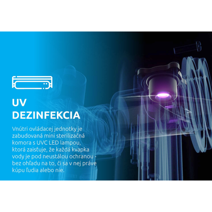 Vnútri ovládacej jednotky je zabudovaná mini sterilizačná komora s UVC LED lampou, ktorá zaisťuje, že každá kvapka vody v Mspa je pod neustálou ochranou - bez ohľadu na to, či sa v nej práve kúpu ľudia alebo nie. Testy ukazujú, že táto lampa dokáže za 4 hodiny zahubiť 52% baktérií. UV LED lampa nemôže poškodiť vaše oči ani pokožku, pretože je kompletne uzavretá vo vnútri čerpadla. Na rozdiel od UVA alebo UVB žiarenia UVC nemá vplyv na životnosť. Vlnová dĺžka UVC žiarenia je starostlivo nastavená tak, aby neovplyvnila životnosť ostatných častí vane. Spotreba tohto UVC systému je veľmi nízka.