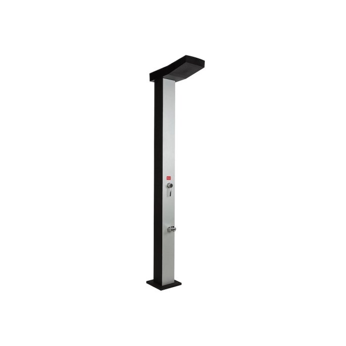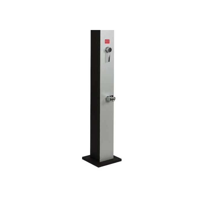 Kerti zuhany UNO Páratlanul nagy, 40 literes térfogattal kültéri használatra . Biztosítja a kerti tömlőből érkező víz melegítését, így tökéletes komfortérzetet biztosít meleg vagy langyos vízzel történő zuhanyozáskor. A vizet a napfény és a zuhanytest melegíti, amely napkollektorként működik. Zuhanyozáshoz a kerti zuhanyt mindig csatlakoztatni kell a vízellátáshoz. Ha nincs csatlakoztatva, nem lehet zuhanyozni. A zuhany fel van szerelve... külön csap térdmagasságban a láböblítéshez. A víz közvetlenül a tömlőből folyik a csapba, nem folyik ki belőle meleg víz. A zuhanyfej 4 csavarral (nem része a csomagnak) van szilárdan a talajhoz rögzítve, ami biztosítja a stabilitását. tökéletes stabilitás .
