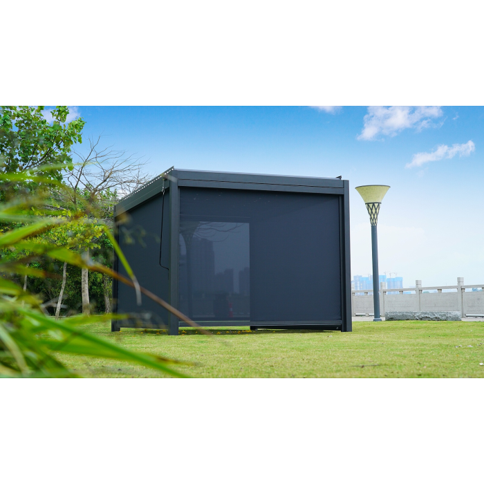 Behúzható roló a 3 m-es pergola LANITPLAST PREMIUM oldalfalához. A redőny egy felső sínből, egy rúddal a roló gurításához és két masszív függőleges vezetősínből áll a roló széleihez.