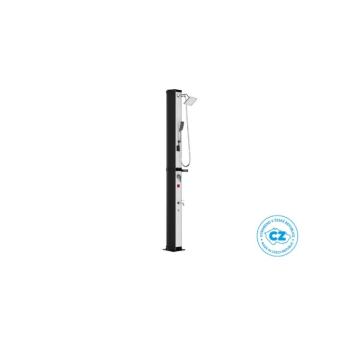 Záhradná dvojdielna a skladná sprcha DUO v oktagonovom prevedení s objemom 60 l pre vonkajšie použitie zaistí ohrev vody privádzanej zo záhradnej hadice a tým perfektný pocit pohodlia pri sprchovaní teplou alebo vlažnou vodou. Sprcha má pákovú batériu, ručnú sprchu aj kohútik na oplach nôh. Ohrev vody zaisťuje slnečné žiarenie a telo sprchy, ktoré funguje ako solárny kolektor. Na sprchovanie musí byť záhradná sprcha stále napojená na vodovodný rad. Ak nie je napojená, nie je možné sa sprchovať. Sprcha sa kotví pomocou 4 skrutiek (nie sú súčasťou balenia) pevne k zemi, čím je zaistená jej perfektná stabilita.